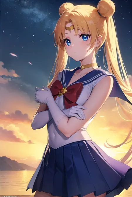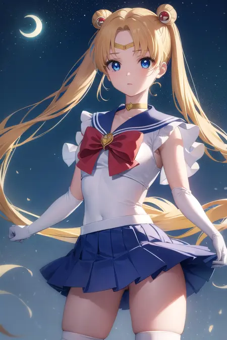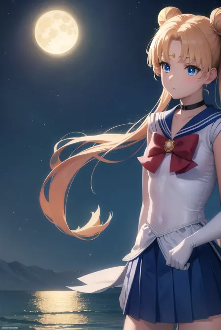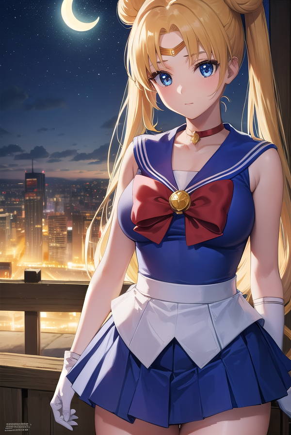 등 패션 리본, 파란색 세일러 칼라, 파란 치마, 부츠, 리본, 브로치, 초커, 초승달, 팔꿈치 장갑, 장갑, 보석, 무릎 부츠, 마법의 소녀, 접힌 치마, 빨간 리본, 빨간 초커, 리본, 세일러 칼라, 세일러 센시 유니폼, 치마, 흰 장갑,