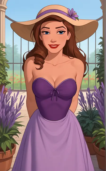 PurpleDress_SarahHawkins_ownwaifu, 1girl, bare shoulders, blue eyes, breasts, brown hair, collarbone, dark skin, hat flower, lipstick, long hair, makeup, purple headwear, cleavage, medium breasts, purple dress, strapless dress, drill hair, mole under eye, purple flower, red lips, bow, hair over shoulder, long dress, sun hat,