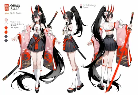 外观: 1个女孩,红眼睛,黑发,长发,极长发,马尾,高马尾,角,红角,鬼,鬼角,发丝垂于眉间,刘海,发丝异常漫长