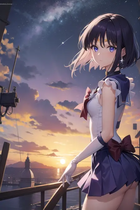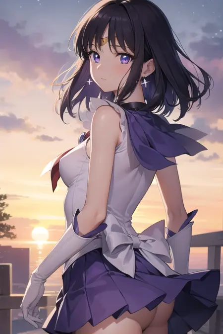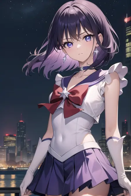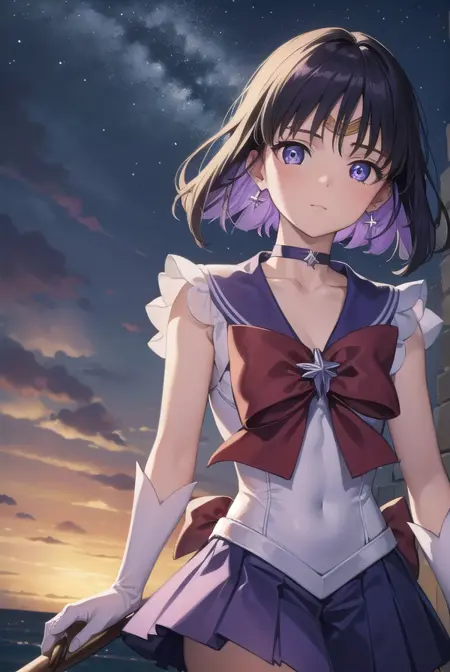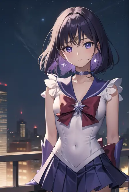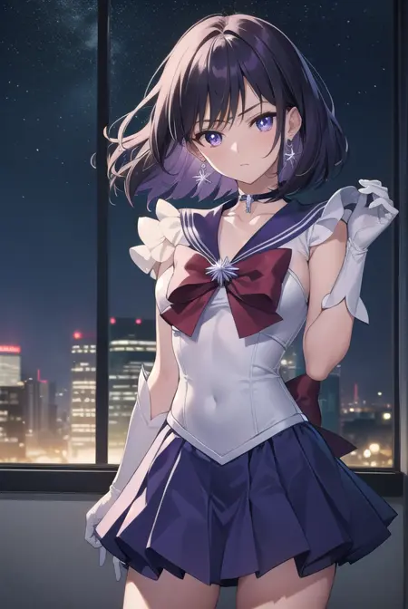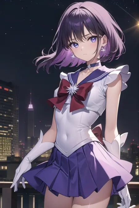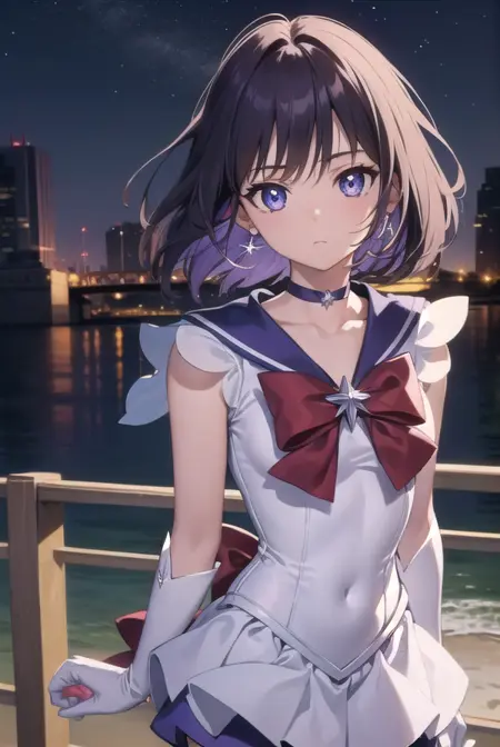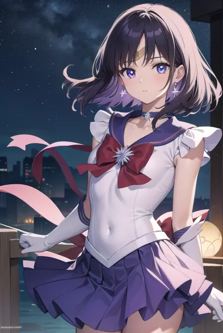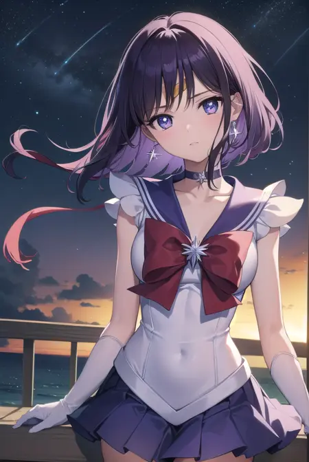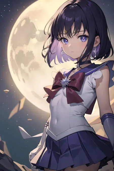 セーラーサターン、(紫の目:1.1)、短い髪、紫の髪、輪飾り、