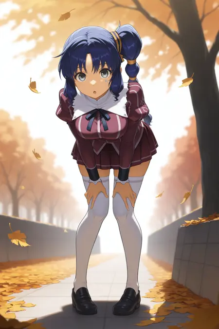 为她的第一季制服添加 "颈带、黑色丝带、白色领子、酒红色双排扣西装、朱丽叶袖、酒红色裙子、超短裙、百褶裙、白色过膝袜";若要添加她的盔甲/装备,则在上述基础上再加入 "护腕、露指手套、金属靴"。