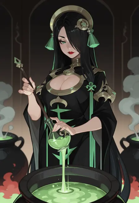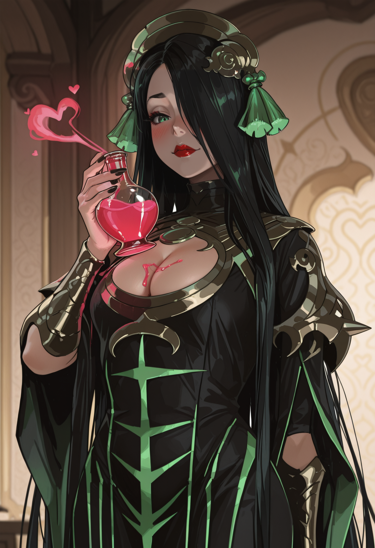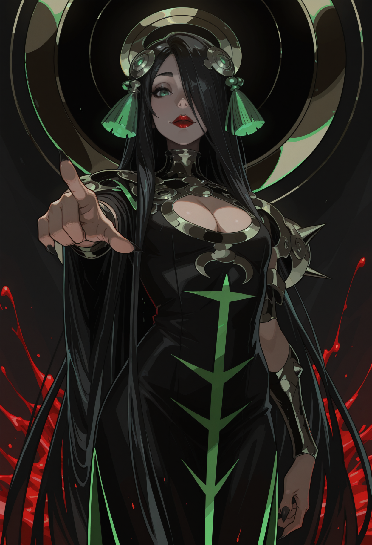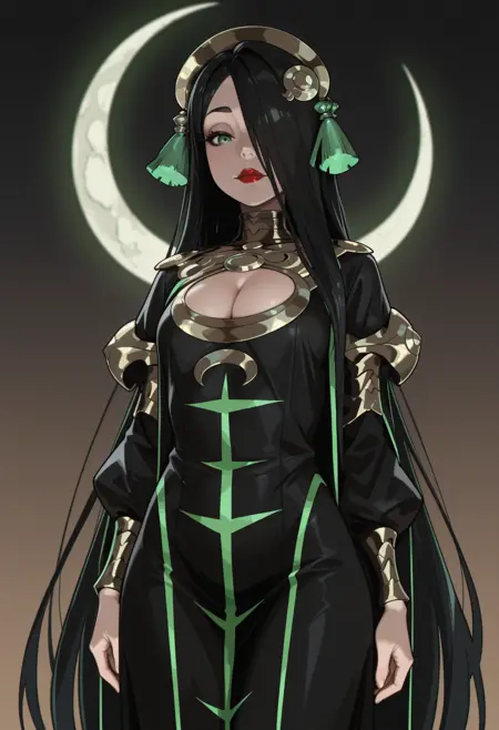 태그: "m3d3a, 머리 장신구, 녹색 덩어리, 한쪽 눈에 걸친 머리카락, 초록색 눈, 매우 긴 머리, 검은 머리, 붉은 입술"