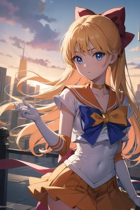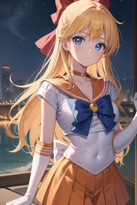 세일러 비너스, 금발, 파란 눈, 활, 머리에 활, 반올림 헤어스타일, 긴 머리, 빨간 활, 왕관,