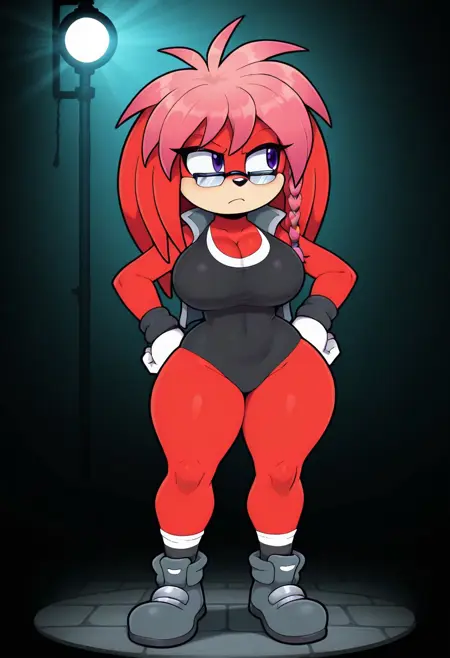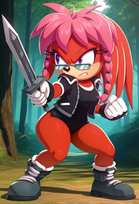 Lara-Su The Echidna, red skin, pink hair, purple eyes, glasses, black leather jacket, black undershirt, white gloves, gray shoes