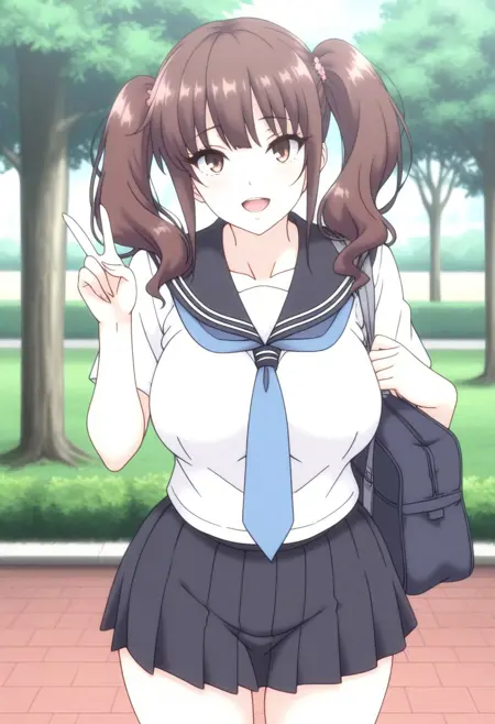 갈색 머리, 갈색 눈, 트윈테일, 큰 가슴,