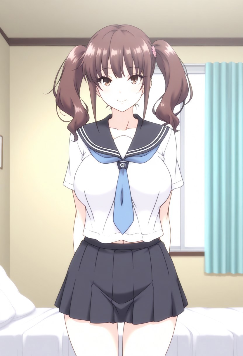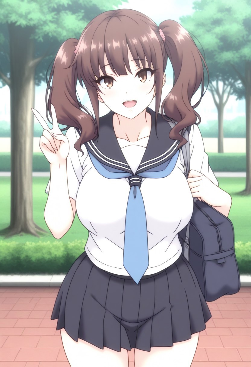茶色の髪、茶色の目、ツインテール、大きな胸、