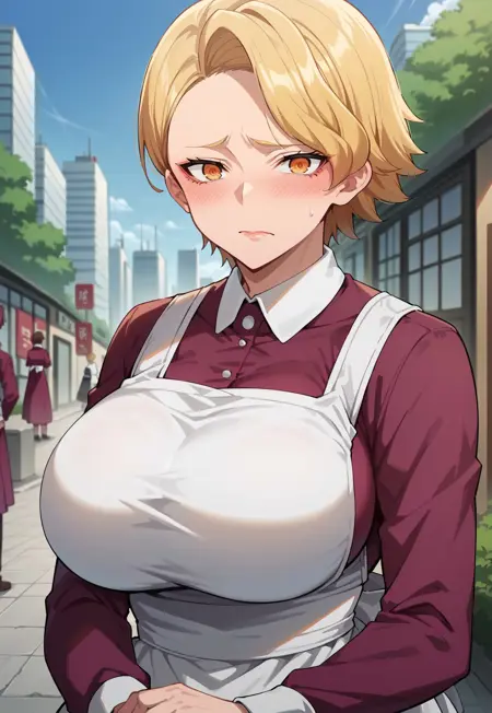 kuina_sazanami, blonde hair, short hair, amber eyes, huge breasts,