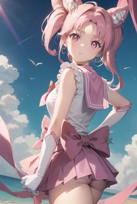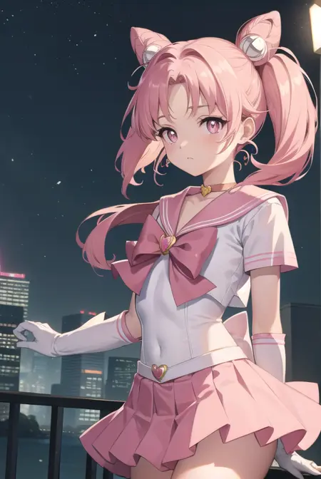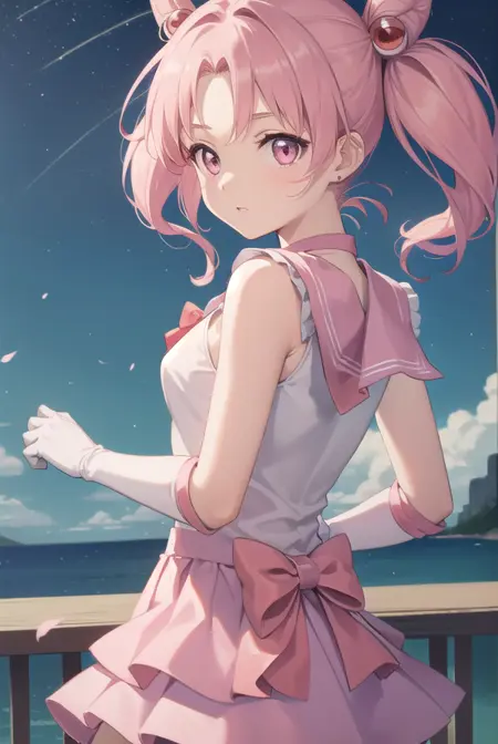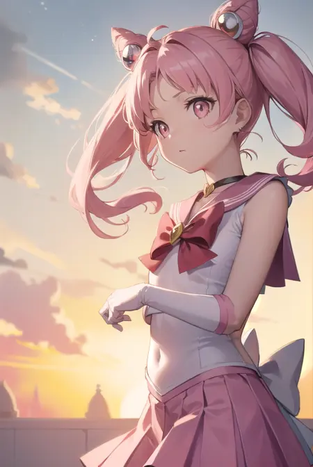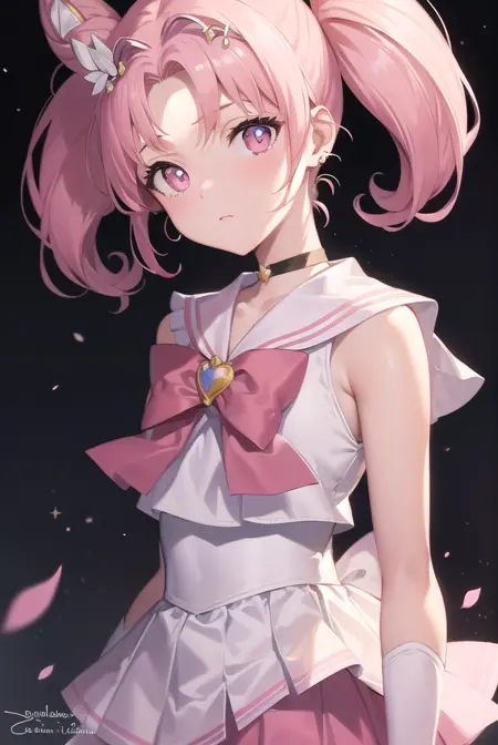 セーラームーンちび、コーン形の髪まとめ、ダブルバング、髪まとめ、髪飾り、(ピンクの目:1.5)、ピンクの髪、短い髪、ツインテール、(環状の髪飾り:1.5)、(分け目のある前髪:1.5)、