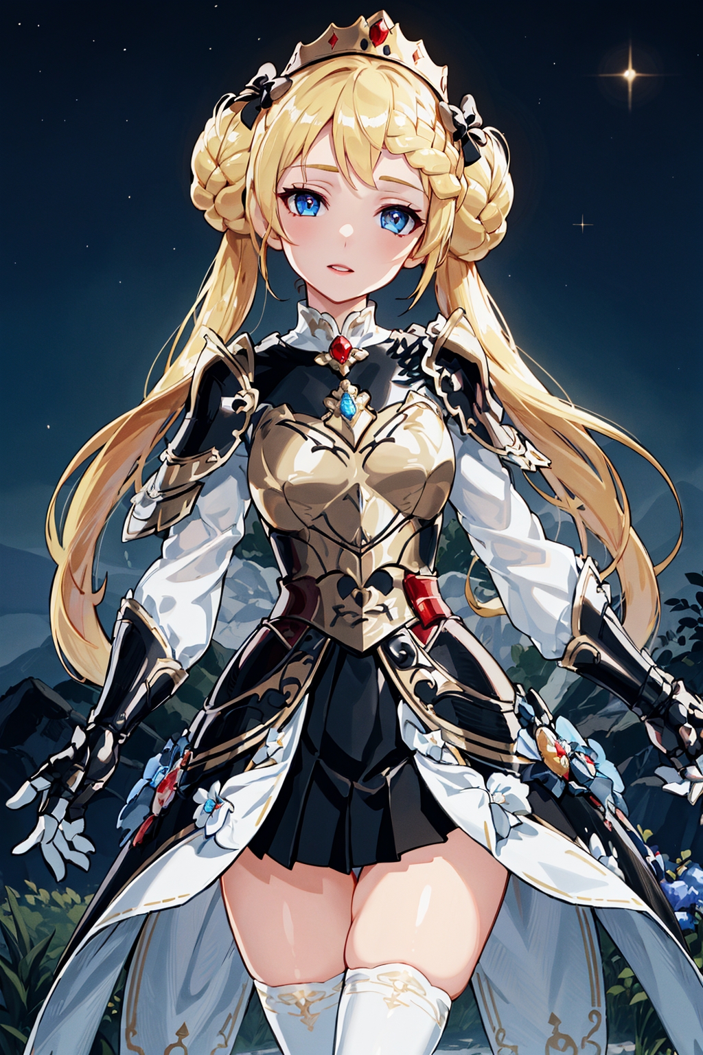 ティアラ、ツインテール、アーマードドレス、編み髪、金髪、非常に長い髪、髪飾り、青い目、黒いスカート、プリーツスカート、長袖、白い手袋、白いハイソックス、