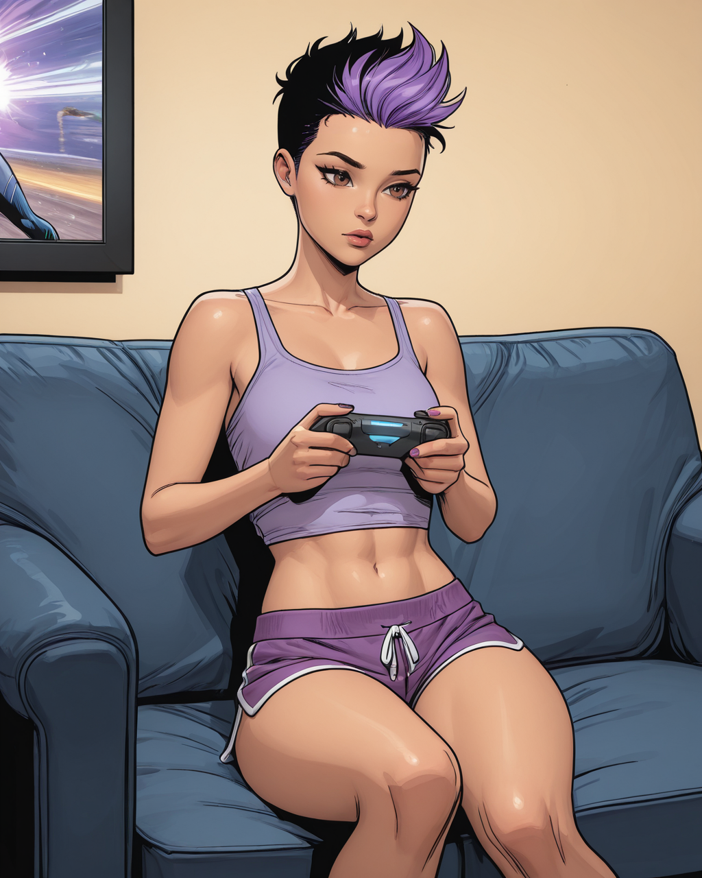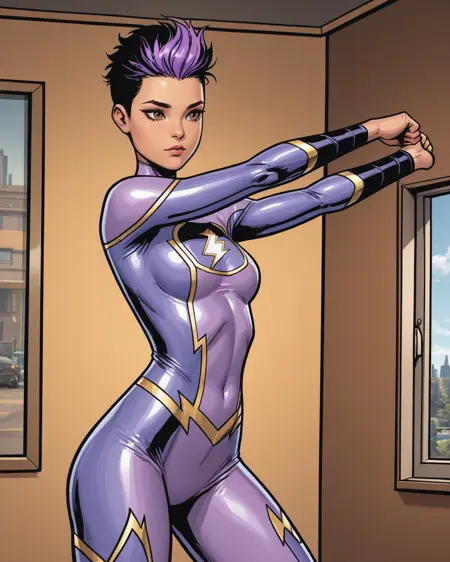 트리거: averyflash, 1girl, black hair, purple hair, two-tone hair, short hair, brown eyes, mask, bodysuit,