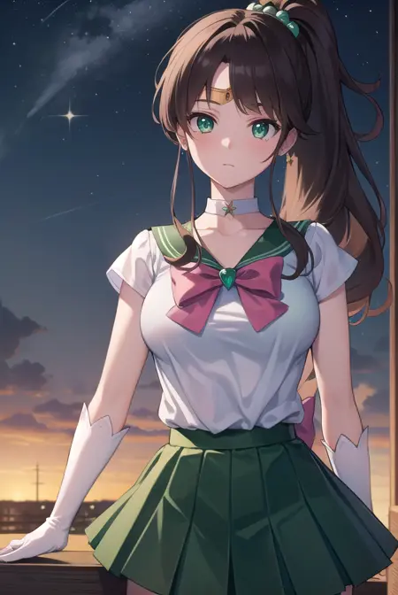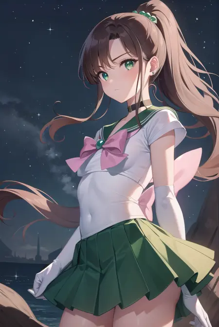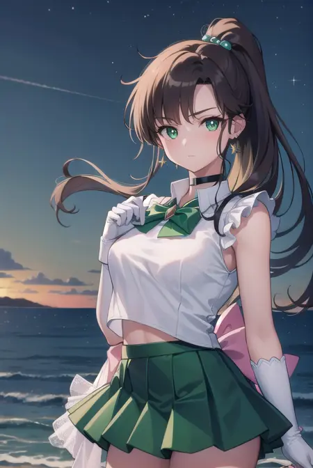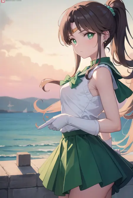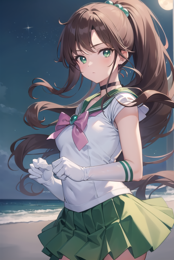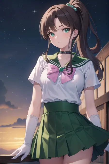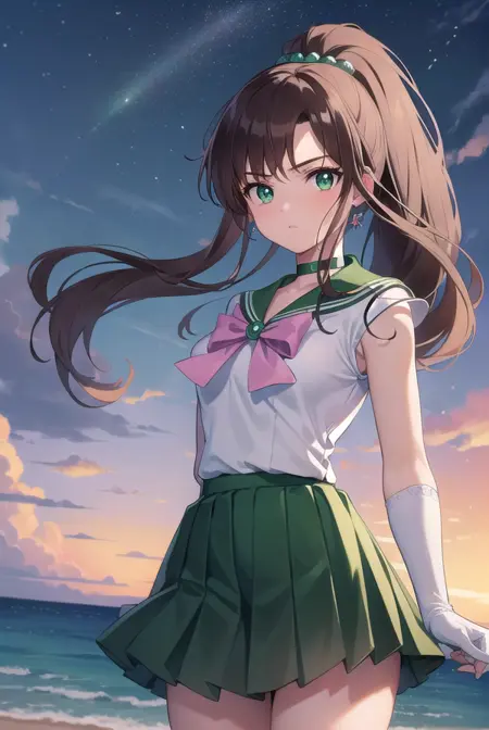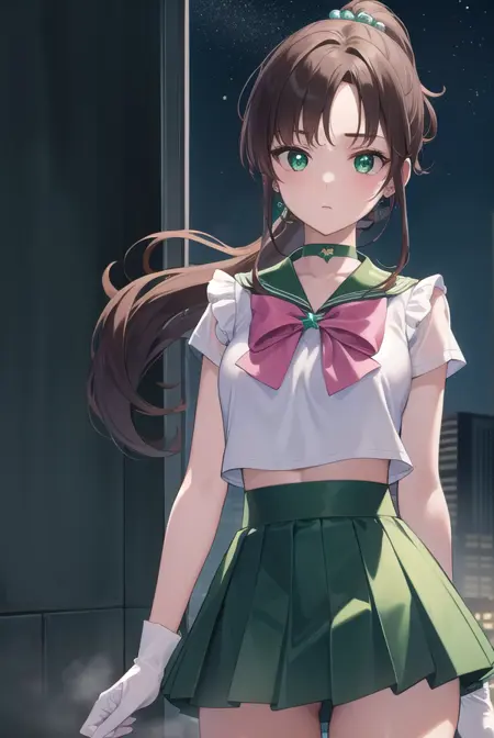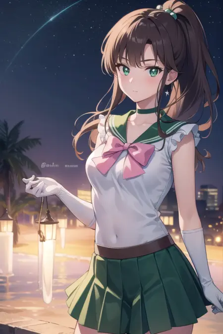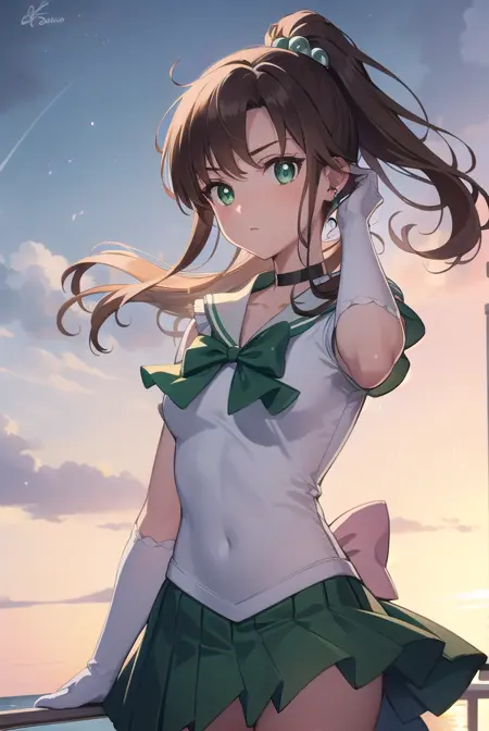 水手木星,棕色头发,发圈,(绿色眼睛:1.5),发饰,中长发,马尾辫,侧发,(分刘海:1.5),
