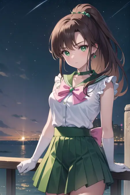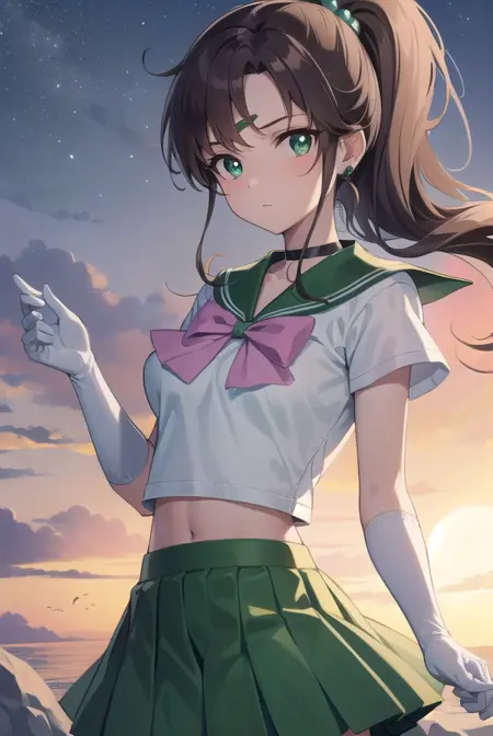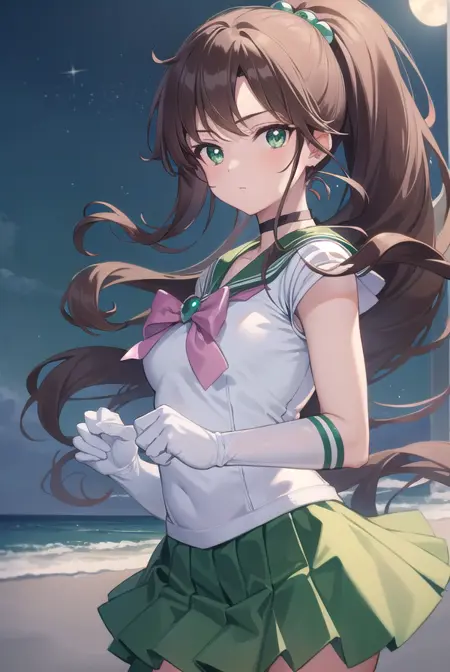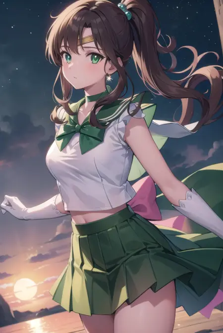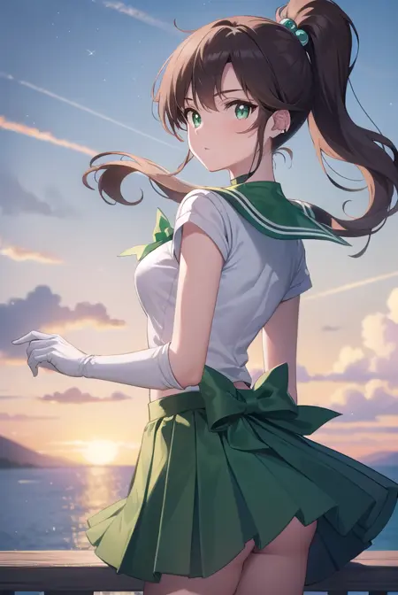 セーラージュピター、茶色の髪、頭輪、(緑の目:1.5)、髪飾り、髪の装飾、ミディアムヘア、ポニーテール、サイドロックス、(分け目ヘア:1.5)