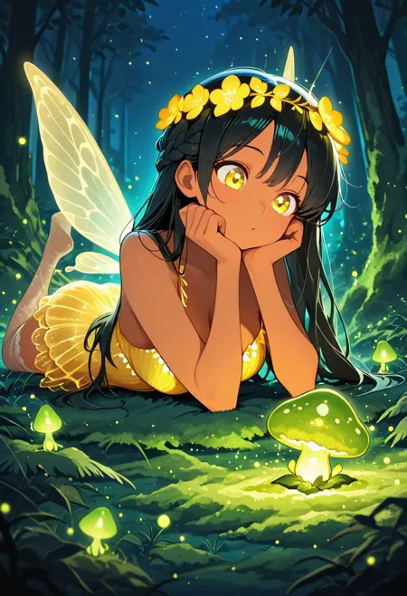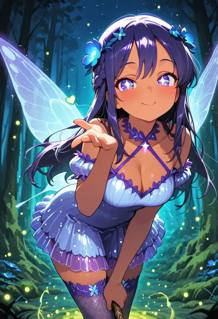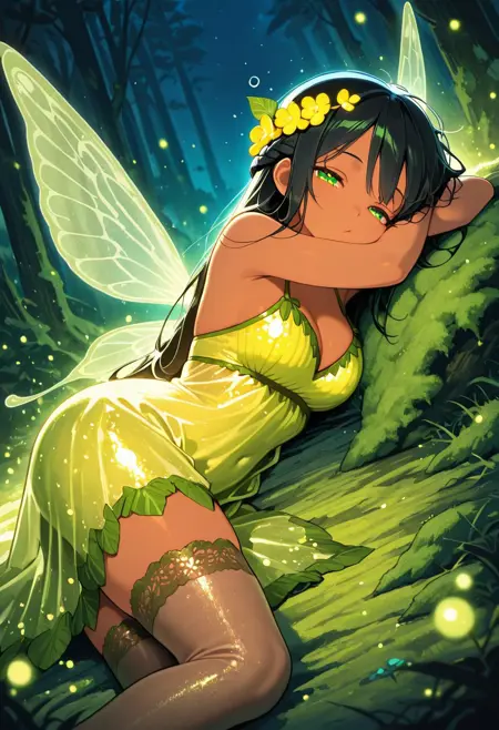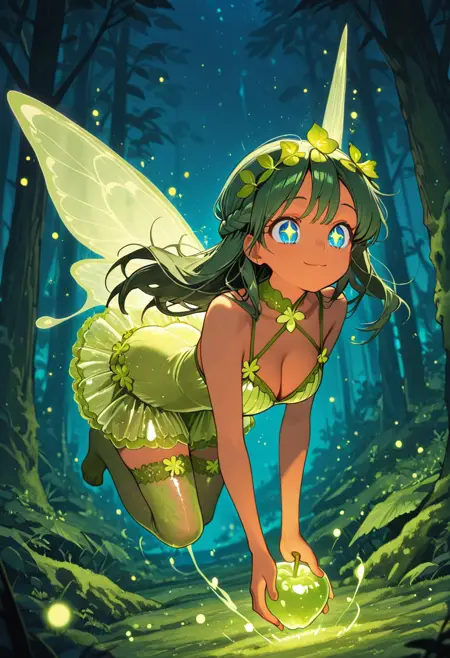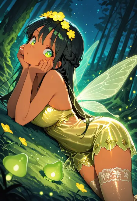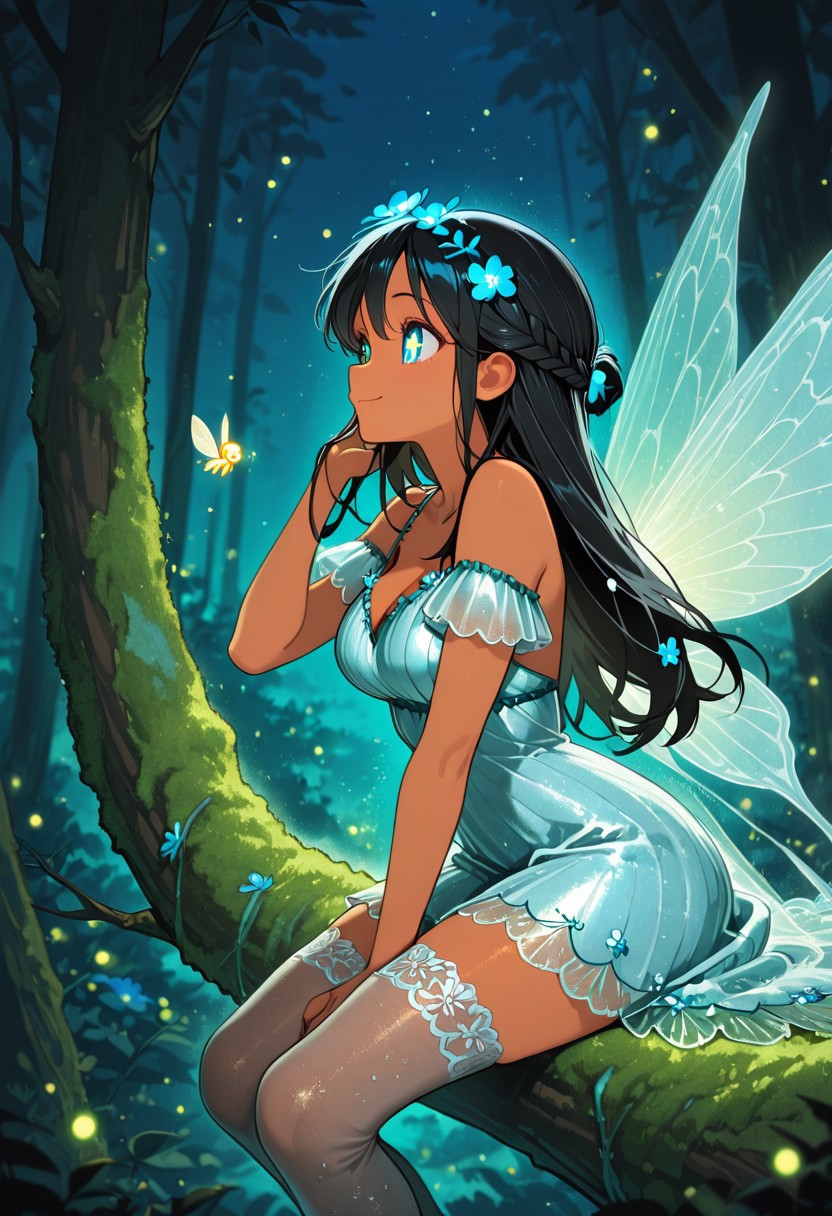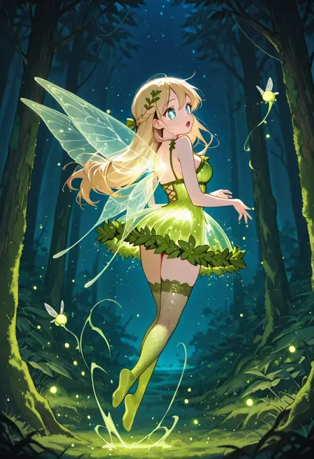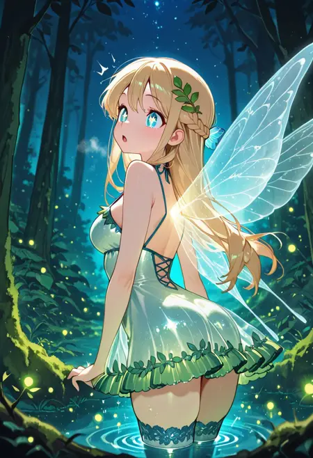 Tags Ex: sparkling blue eyes, long hair, french braid, short glittering green lacy silk fairy dress, sweetheart neckline, translucent lacy thigh socks, glowing blue flowers in hair, head tilt, glitter fairy wings