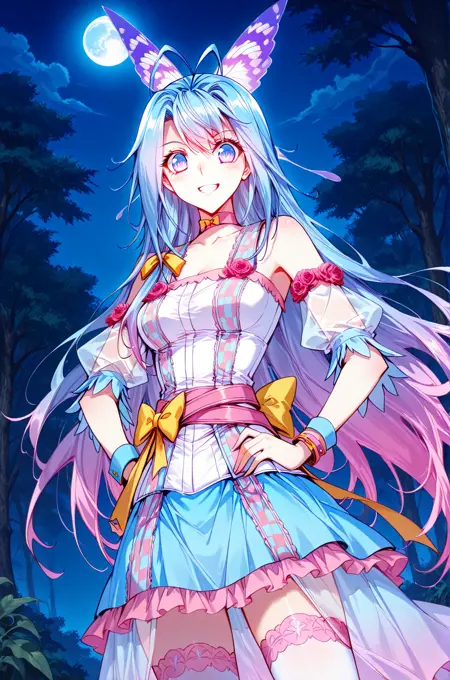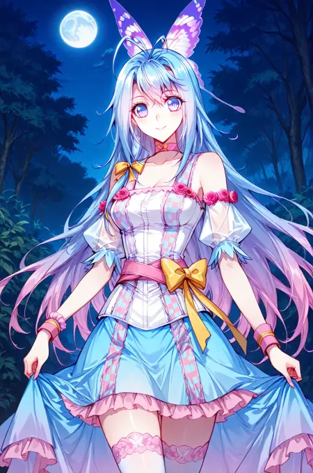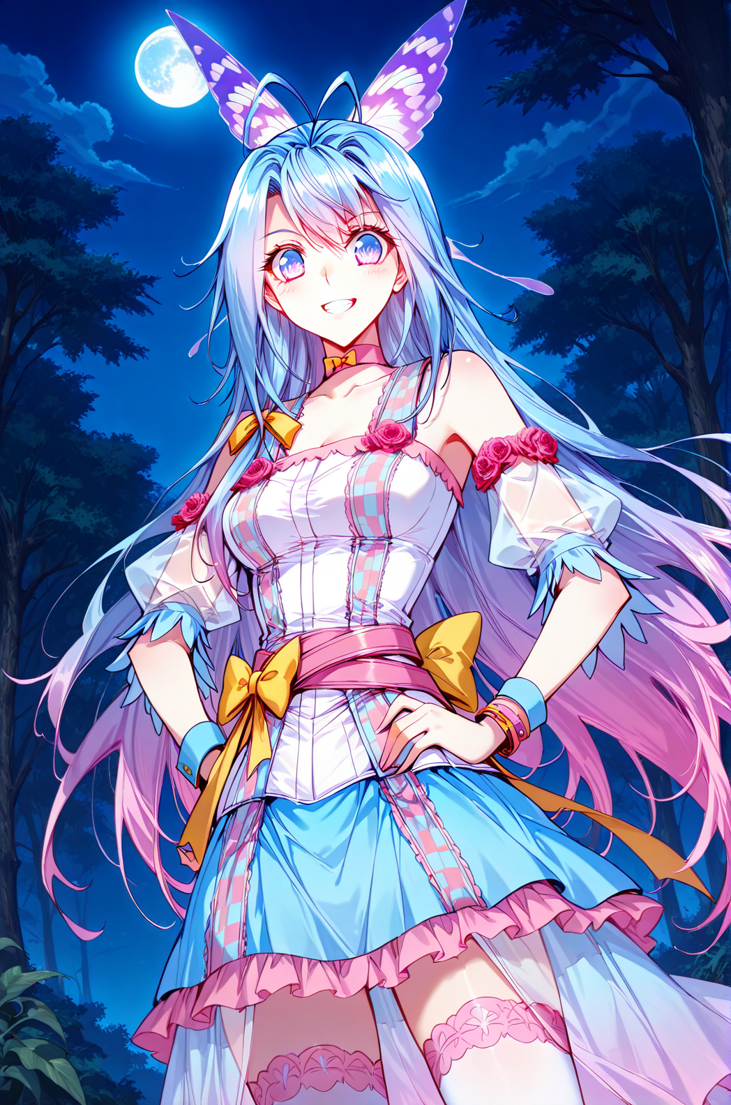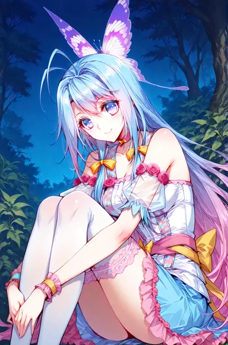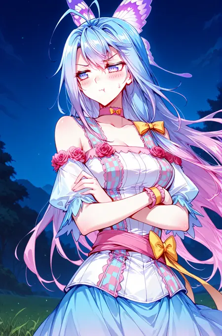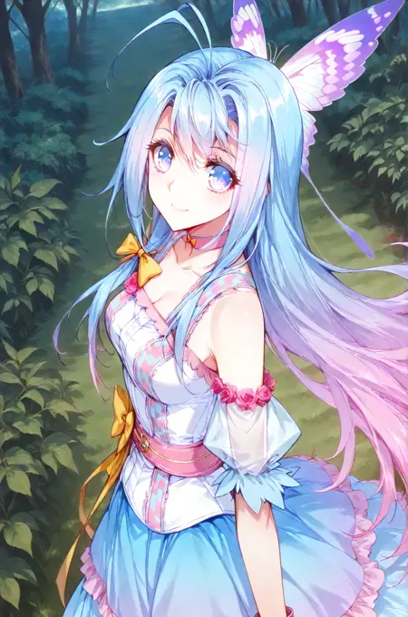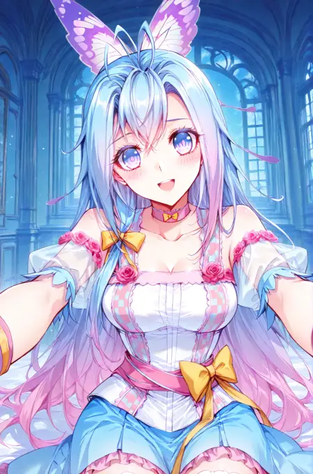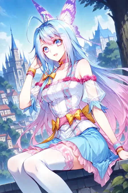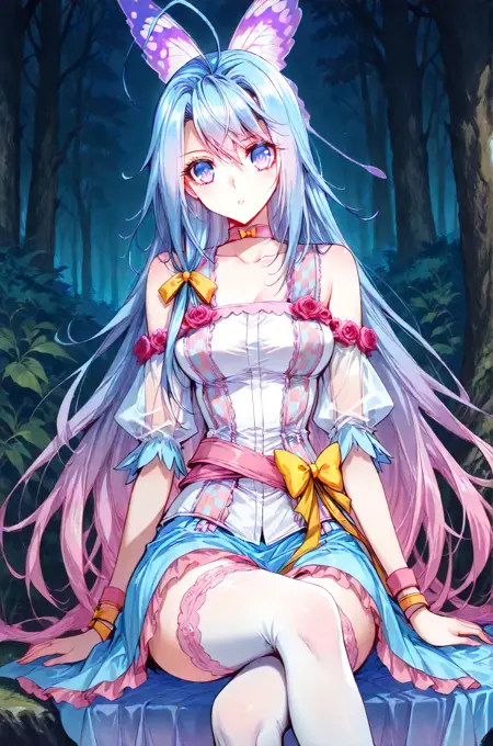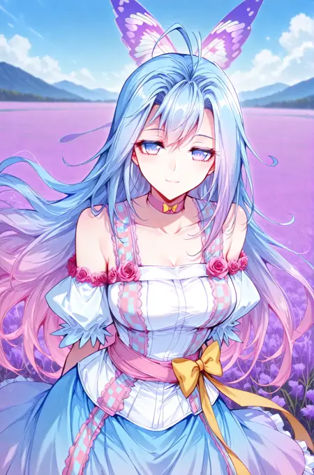 | 학습된 단어 | Wutong, 1girl, solo, lavender blue eyes, silver blue hair, pink hair tips, gradient hair, color gradient, very long hair, uneven bangs, see through bangs, long bangs, hair between eyes, long sidelocks, double ahoge strands, layered hair, hair ornament, butterfly hair ornament, hair ribbon yellow,복사됨! Wutong_outfit, white dress, off shoulder, floral trim, rose appliques, collarbone, checkered straps, pink ruffles, short sleeves, puff sleeves, blue cuffs, frilled cuffs, leaf trim, fitted bodice, checkered trim, pink waist sash, wrapped belt, yellow waist bow, blue short skirt, red hem ruffle, underskirt, long underskirt, underskirt sheer, hem ruffle, white thighhighs, pink choker, yellow neck bow, pink bracelets, frilled wristband,복사됨! |