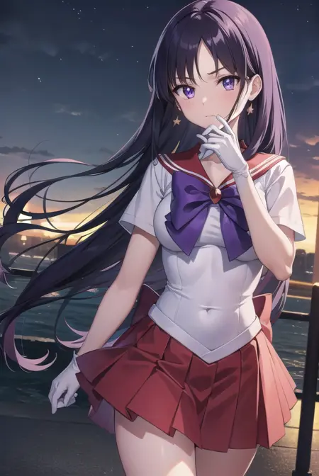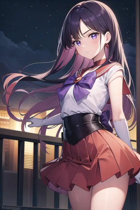 手袋、ハイヒール、魔法少女、ミクロスカート、プリーツスカート、赤い靴下、赤いスカート、セーラー戦士の制服、靴、スカート、白い手袋、リボン、紫のリボン、セーラーカラー、赤いセーラーカラー、