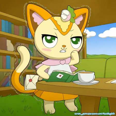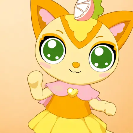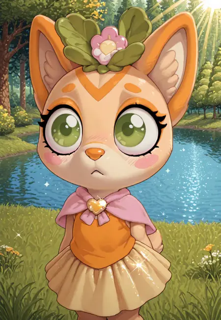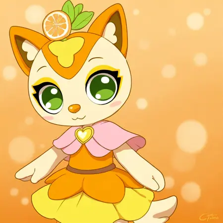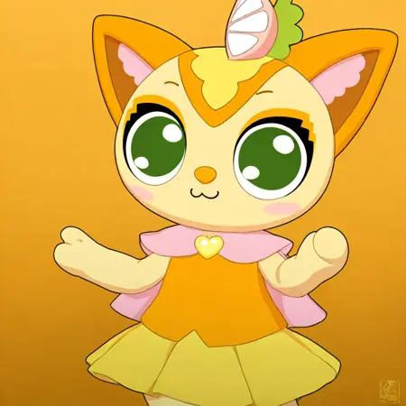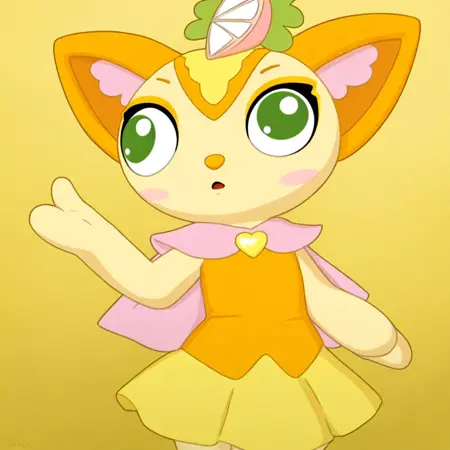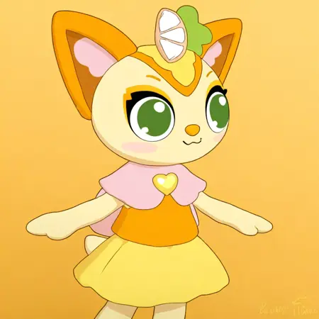 | Trained Words | (anthro, furry, furry female), orange tia, deer, (light orange skin, light orange fur, bodyfur), orange deer ears, orange nose, big eyes, green eyes, eyelashes, makeup, eye makeup, orange eyeshadow, blush stickers, orange sleeveless shirt, gold heart-shaped brooch, yellow skirt, pink capelet, (pink capelet layered over sleeveless shirt and skirt), food-themed hair ornament, pink citrus slice hair ornamentCopied! |