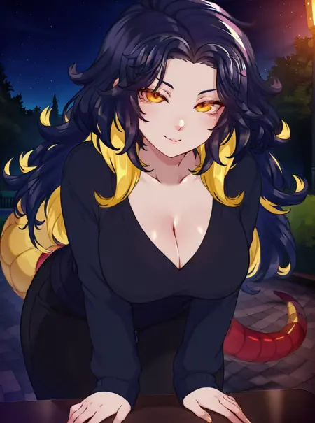 Helpful tags: multicolored hair, black hair, blonde hair, slit pupils, amber eyes, striped tail, snake tail, multicolored tail