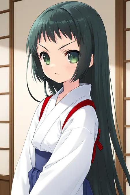 yaeno nadeshiko, green eyes, black hair, green hair, very long hair, sidelocks, straight hair,
