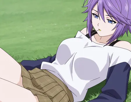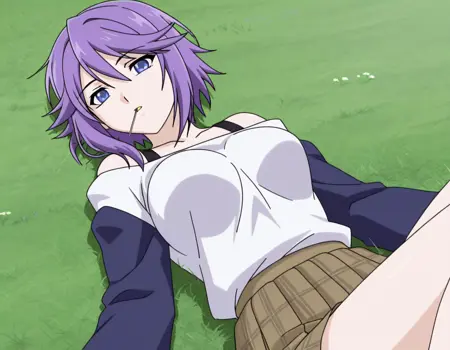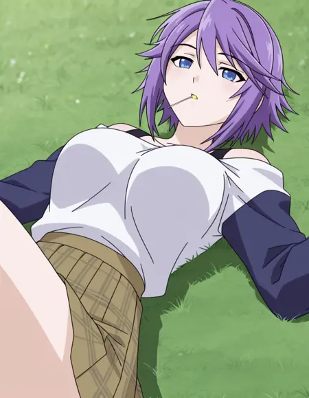 purple hair, large breasts, short hair, jewerly, mouth hold, lollipop, off shoulders, White shirt, skirt, plaid skirt, purple sidelocks, blue sleeves,