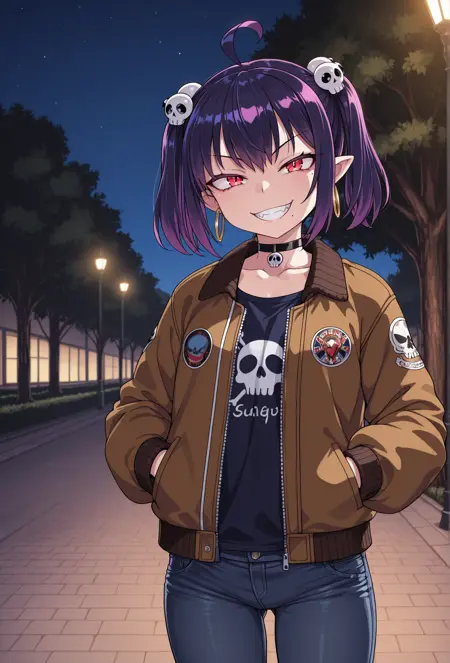 levi, 1girl, mole under mouth, skull hair ornament, hoop earrings, twintails, dark purple hair, red eyes, constricted pupils, v-shaped eyebrows, crazy eyes, crazy,