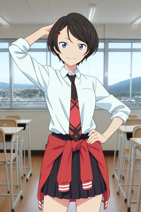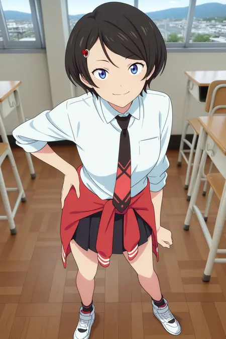 namiko, short hair, black hair, parted bangs, hairclip, blue eyes, sleeves rolled up, white shirt, collared shirt, black necktie, red necktie, red jacket, track jacket, jacket around waist, black skirt, pleated skirt, black socks, striped socks, ankle socks, white footwear, sneakers