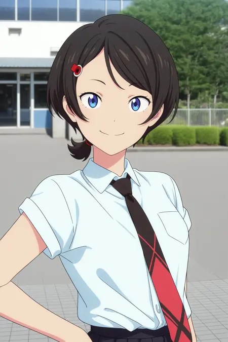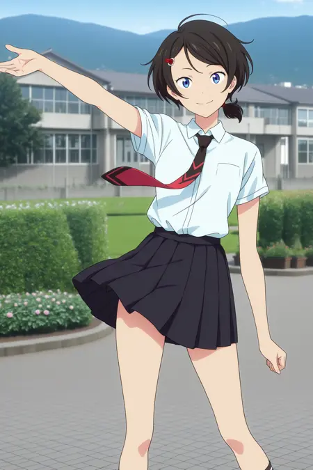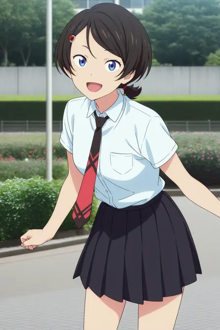 namiko, short hair, black hair, short ponytail, hair tie, parted bangs, hairclip, blue eyes, short sleeves, white shirt, collared shirt, black necktie, red necktie, loose necktie, black skirt, pleated skirt, black socks, striped socks, ankle socks, white footwear, sneakers