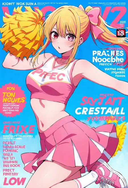 Outfit 13: pom pom (cheerleading),skirt,shoes,sneakers,socks,pink skirt,pink footwear,midriff,bow,white socks,crop top,holding pom poms,pleated skirt,pink bow,breasts,choker,ponytail,side ponytail,ribbon,pink choker,bare shoulders,hair bow,tube top,strapless,sleeveless,hair ribbon,miniskirt,medium breasts,shirt