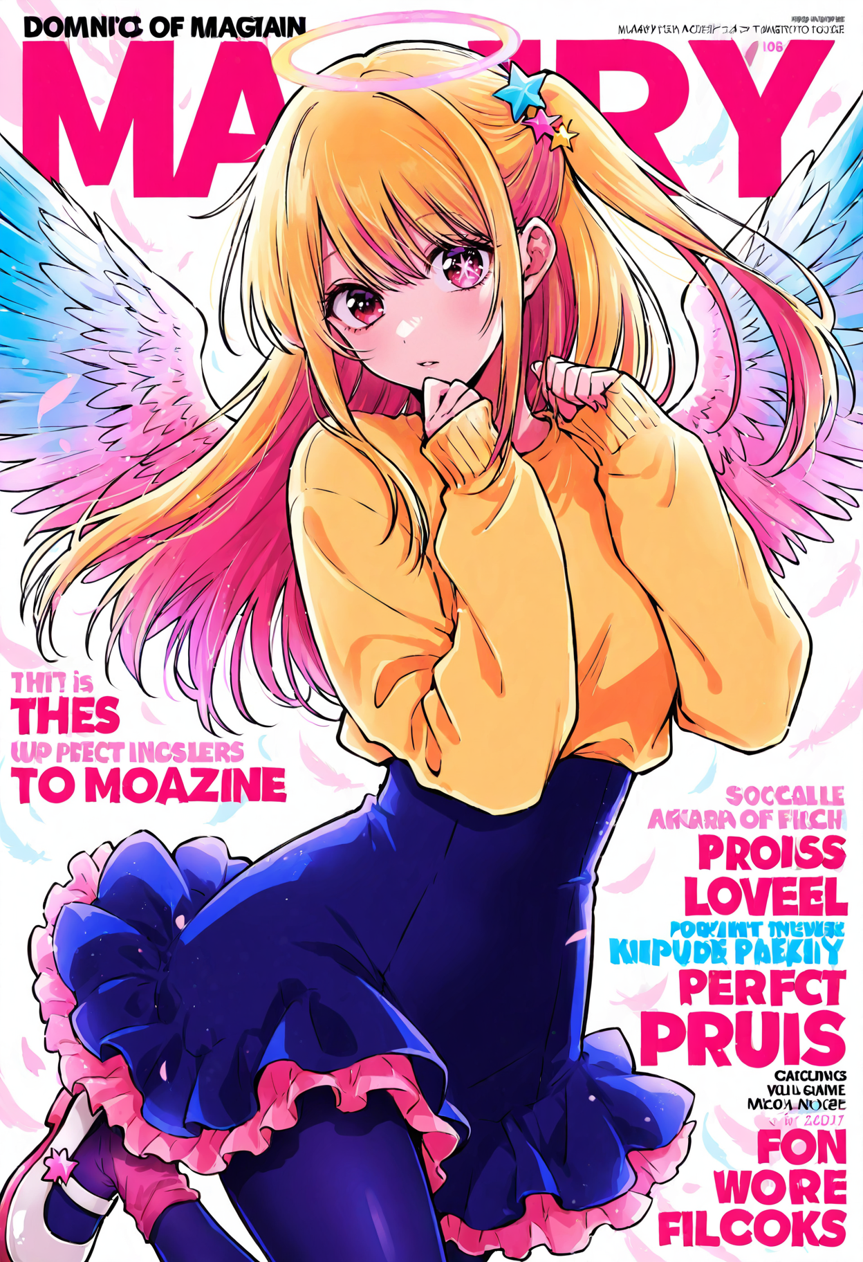 Outfit 4: hair ornament,star hair ornament,gradient hair,halo,wings,angel wings,feathered wings,multicolored wings,frills,shirt,sweater,yellow sweater,long sleeves,sleeves past wrists,skirt,pink skirt,frilled skirt,blue skirt,high-waist skirt,pantyhose,blue pantyhose,pink pantyhose,socks,pink socks,shoes,white footwear,pink footwear,mary janes