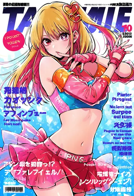 Outfit 8: gloves,fingerless gloves,skirt,nail polish,pink skirt,breasts,midriff,heart hair ornament,hair ornament,bare shoulders,miniskirt,crop top,blue nails,see-through,red nails,pink gloves,idol,fingernails,detached sleeves,pink nails,aqua nails,red gloves,pink sleeves