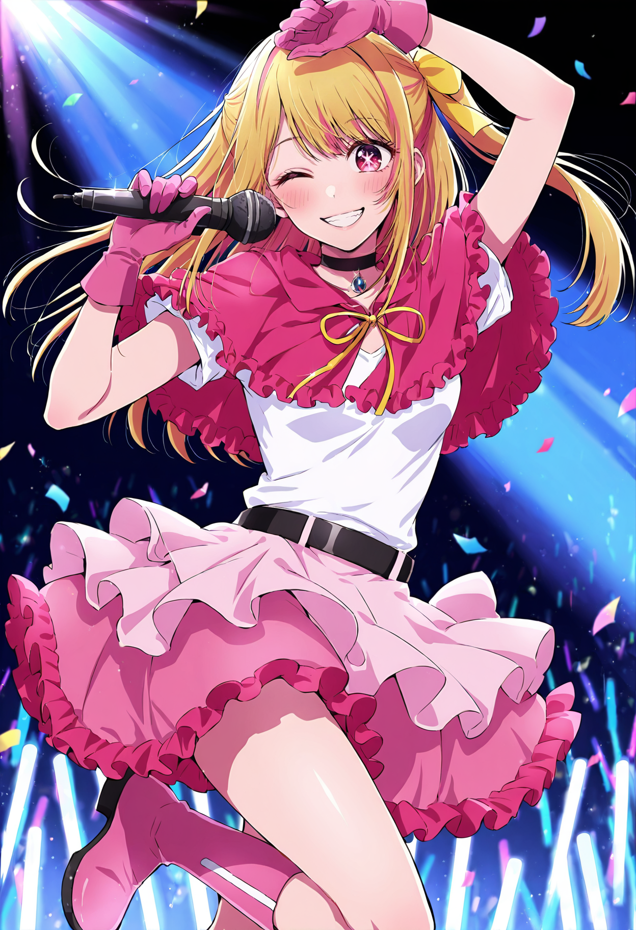 Outfit 12: pink footwear,idol,star hair ornament,dress,hair ornament,wrist cuffs,idol clothes,boots,bow,pink dress,bare shoulders,pink bow,two side up,sleeveless,skirt,frills,shoes,earrings,socks,jewelry,frilled dress,breasts,footwear bow,ribbon,sleeveless dress