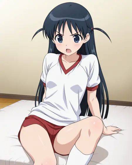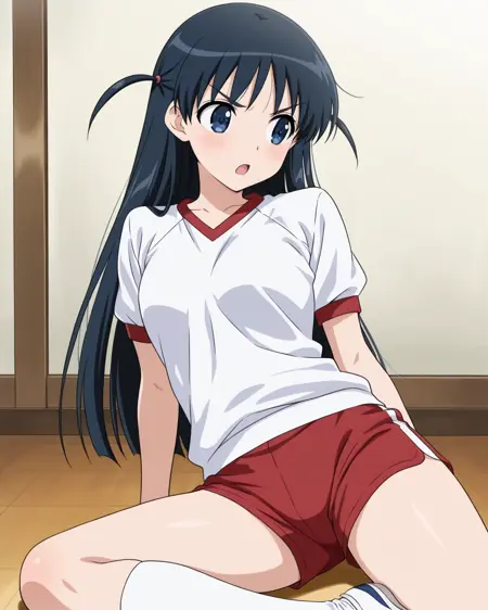 Tenma Tsukamoto, Tenma, Black hair, dark blue eyes, Two thin long side pigtails that stick out sideways, 1girl, solo, socks, shorts, gym uniform, long hair, white socks, arm support, two side up, short sleeves, shirt, open mouth, red shorts, kneehighs, v-shaped eyebrows, gym shorts