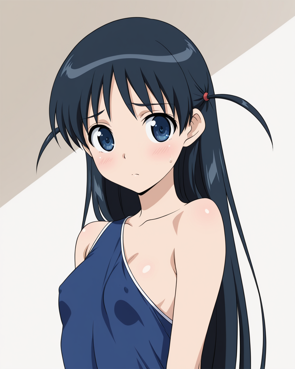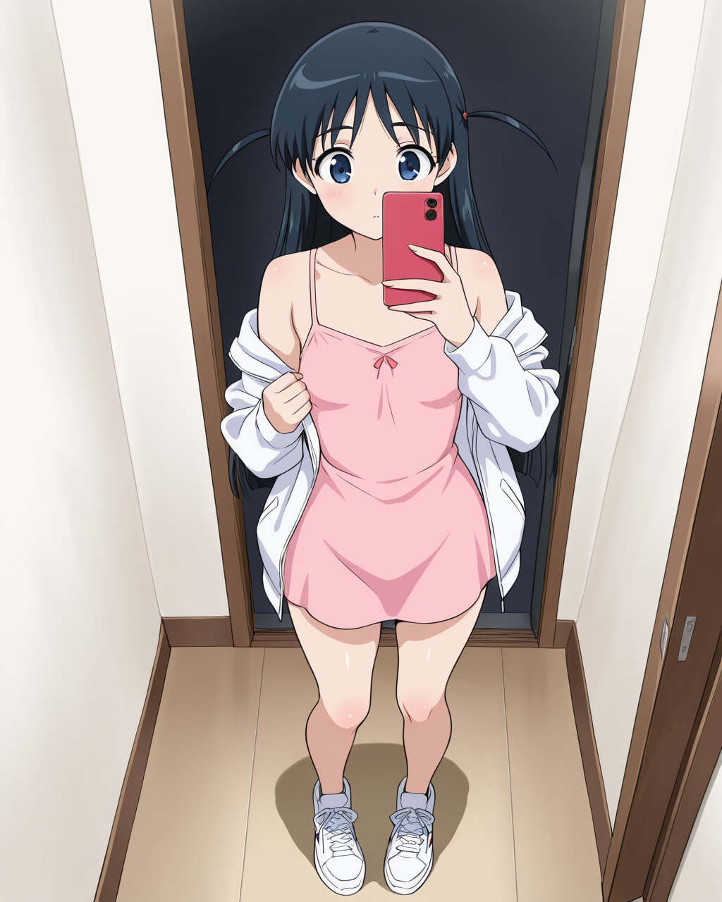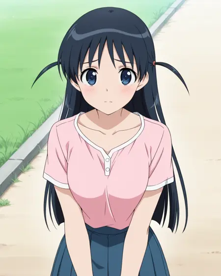Tenma, Black hair, dark blue eyes, Two thin long side pigtails that stick out sideways, 1girl, solo, grass, skirt, shirt, pink shirt, outdoors, short sleeves, two side up, looking at viewer, closed mouth, collarbone