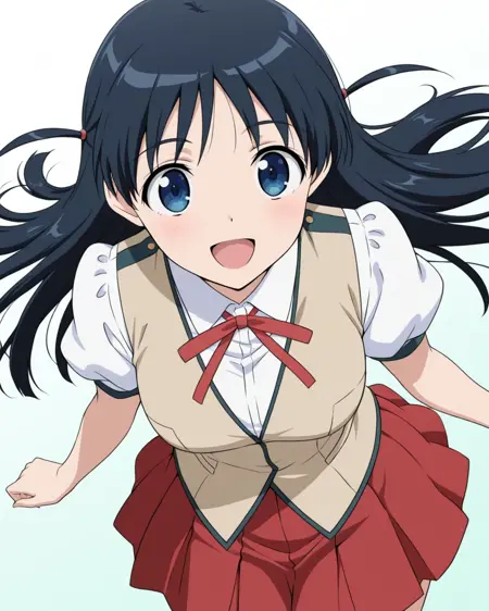 Tenma Tsukamoto, Tenma, Black hair, dark blue eyes, Two thin long side pigtails that stick out sideways, 1girl, solo, skirt, long hair, school uniform, short sleeves, pleated skirt, red skirt, from above, smile, puffy sleeves, vest, :d, shirt, open mouth, white shirt, puffy short sleeves, neck ribbon, ribbon, red ribbon, collared shirt, floating hair