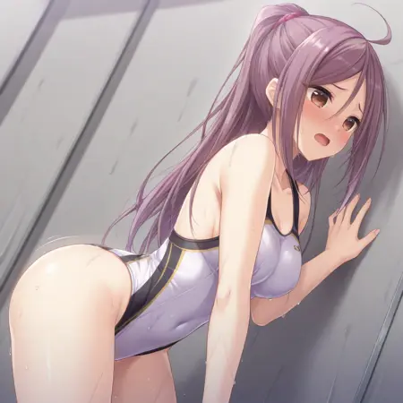 Moribe,Ahoge, Long hair,Violet hair, brown eyes,Ponytail,Parted in Middle
