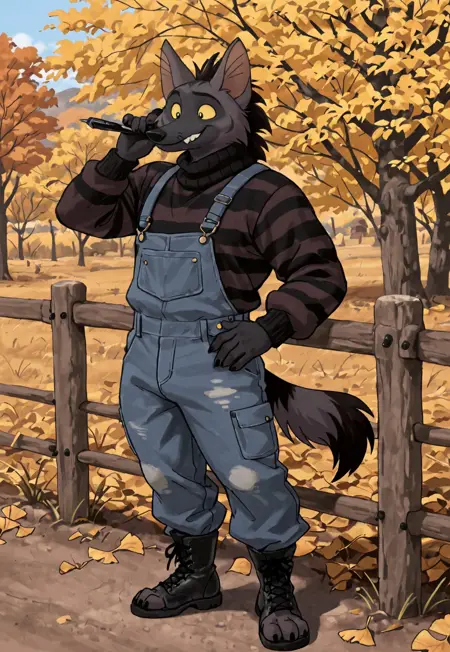 提示:哈亚,毛茸茸的,雄性,土狼,深灰色皮毛带黑色条纹,长而窄的吻部带有胡须,黄色巩膜