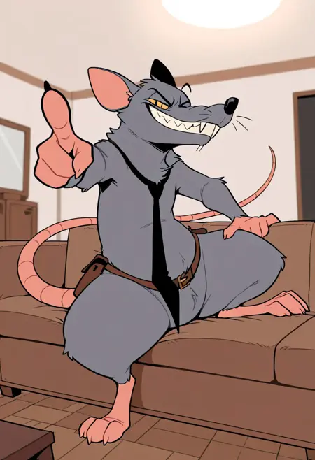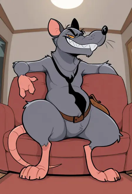 prompt: male, rat, long striped pink tail, large yellow eyes, anthropomorphic, rat, skin-tone inner ears, grey fur, black necktie, 4 fingers, whiskers, no humans, claws, floating eyebrows, brown leather belt with a bag, fangs out, wide thighs, pear shaped body, 3 toes, skin-tone feet,