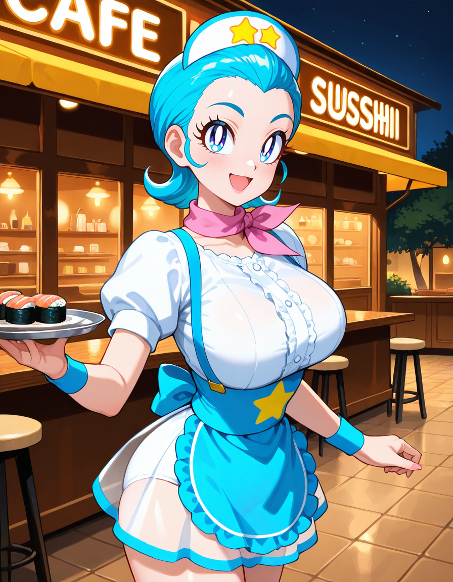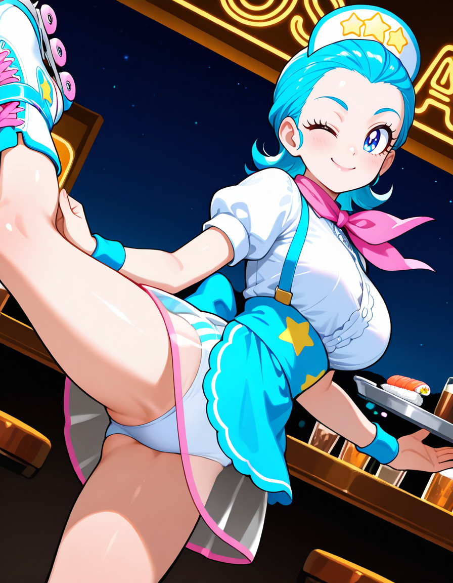 | トレーニングワード | (bam2-comet), (retro artstyle, official style, blue eyes, eyelashes, blue hair, short hair, hair slicked back, large breasts), (waitress cap, pink neckerchief, blue suspenders, blue waist apron, yellow star print, white frilled shirt, puffy short sleeves, blue wristband), (white see-through skirt, miniskirt, white buruma, pink inline skates)コピーしました! |