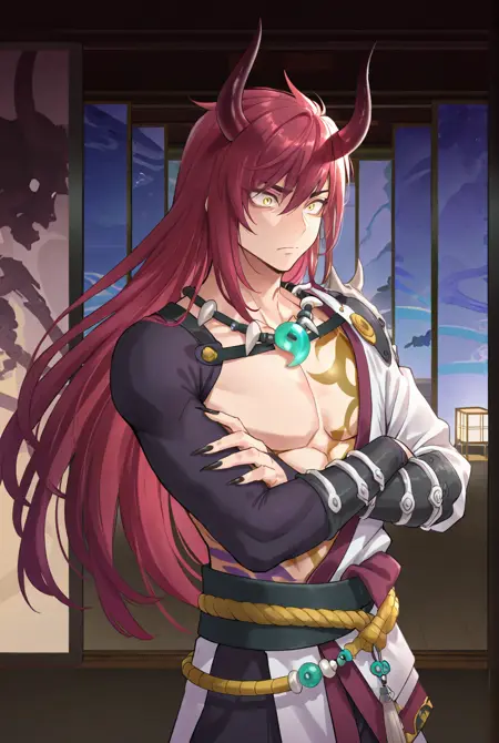 yasha 0nmyoji, long hair, red hair, horns, yellow eyes, pectorals, tattoo, sharp fingernails, jewelry, long fingernails, black nails, sandals