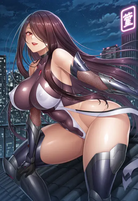 第一套服装:太阴忍者服,忍者,紧身衣,紧身服装,高腿紧身衣,不可能紧身衣,露肩,高领,黑色项圈,红色宝石,露腹,白线,可拆卸袖子,肘部手套,渔网袜,黑色手套,护胫,护臂,遮盖肚脐,大腿靴,过膝袜,高跟靴
