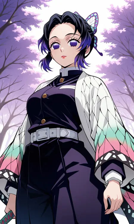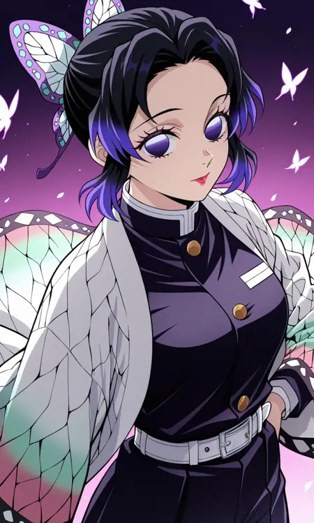 小蝶しのぶ、1girl、シングル、短い髪、前髪、多色の髪、黒髪、紫髪、紫の目、蝶の髪飾り、赤い唇、白い羽織、蝶のプリント、黒いジャケット、広い袖、ボタン、白いベルト、ふくらはぎパンツ、黒いパンツ