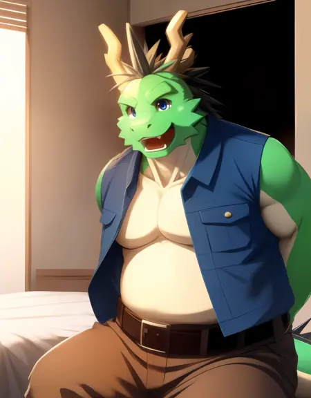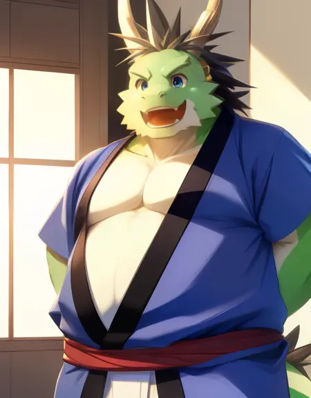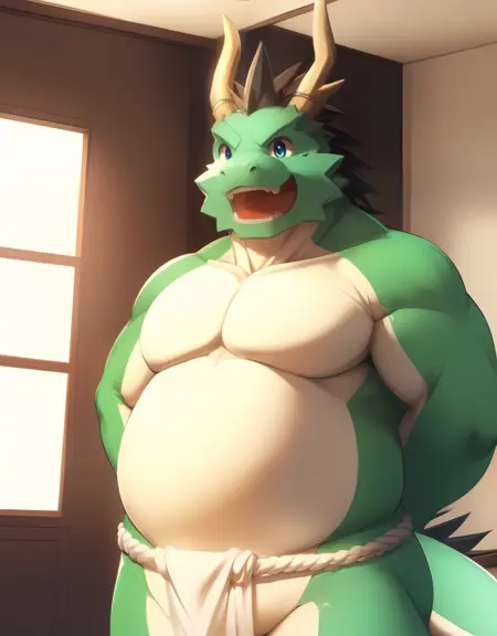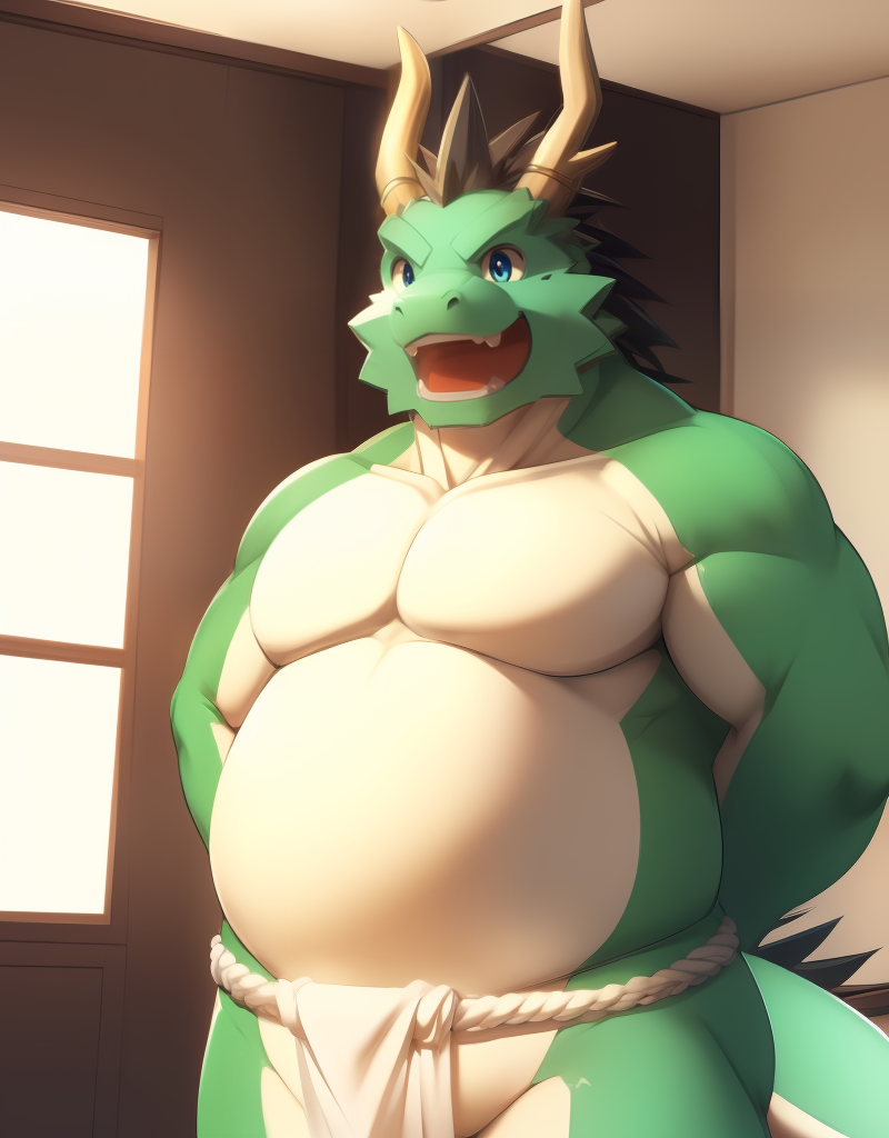 Related words : green skin, black hair, spiked hair, short hair, thick eyebrows, antlers, dragon tail, dragon horns, headband, nejiri hachimaki, sleeveless jacket, brown pants, white male underwear, japanese clothes, hand fan, paper fan, blush (v3-)