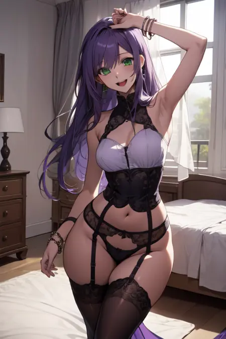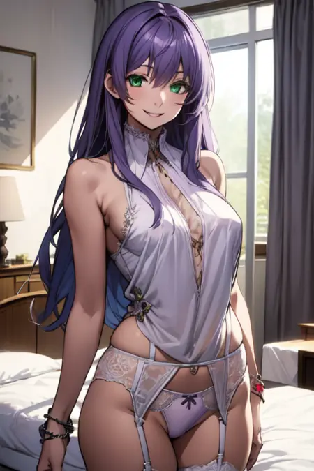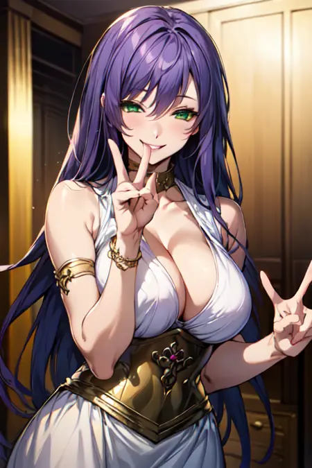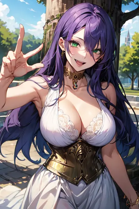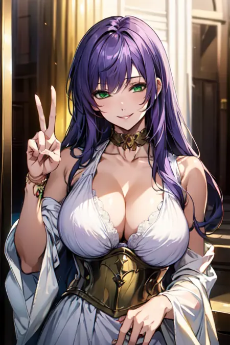 衣装1: サシャ、紫髪、ロングヘア、緑の目、白いドレス、チョーカー、ロングドレス、ノースリーブ、肩出し、バストライン、鎖骨、ゴールドアクセサリー、コルセット