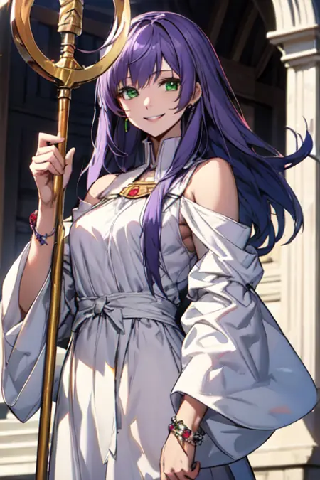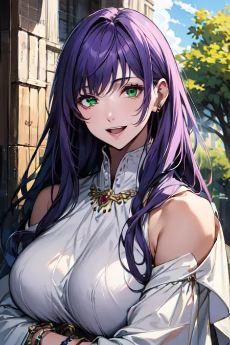 衣装2: サシャ、紫髪、ロングヘア、緑の目、白いドレス、ワイドスリーブ、肩出し、ロングスリーブ、ロングドレス、ジュエリー、ブレスレット、服のカットアウト、肩のカットアウト
