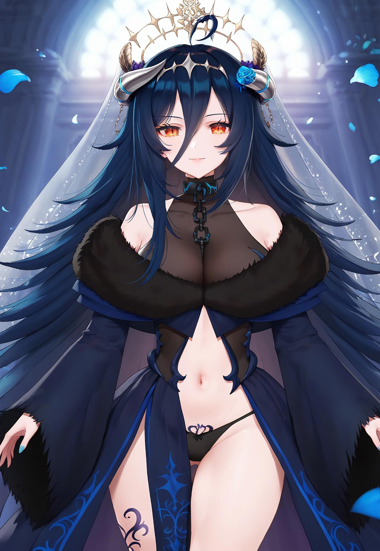 Emma2,1girl,单独,长发,乳房,看着观众,刘海,大乳房,发饰,红眼睛,连衣裙,头发遮住眼睛,裸露肩膀,蓝发,锁骨,花朵,呆毛,角,虚拟YouTuber,衣领,毛皮镶边,链条,蓝花,蓝玫瑰,遮盖的锁骨,长袖,肚脐,珠宝,非常长的头发,宽袖,黑色鞋子,橙色眼睛,透明,袖子超过手腕,服装剪裁,纹身,腿部纹身,面纱,渐变服装