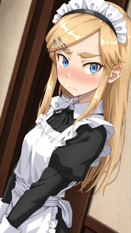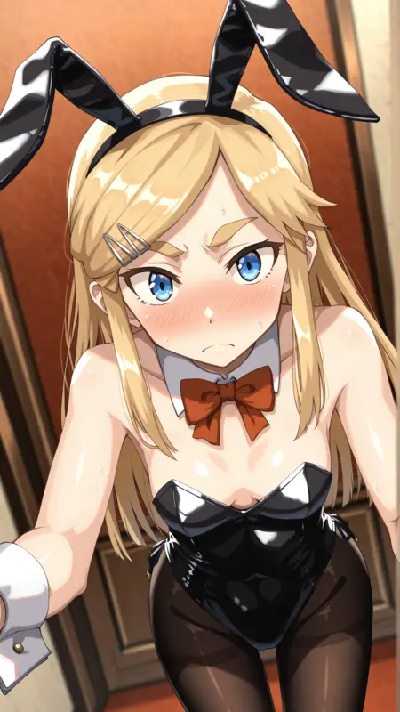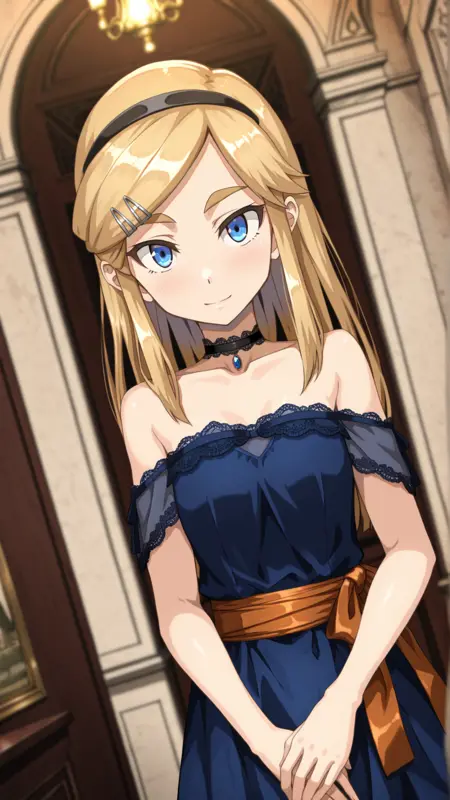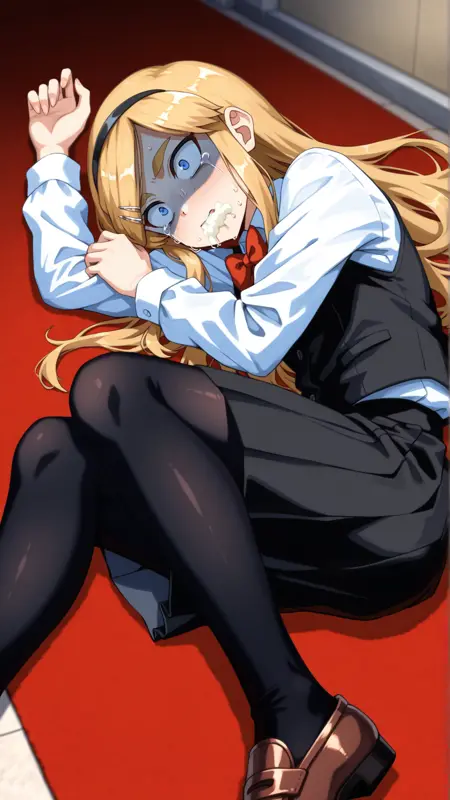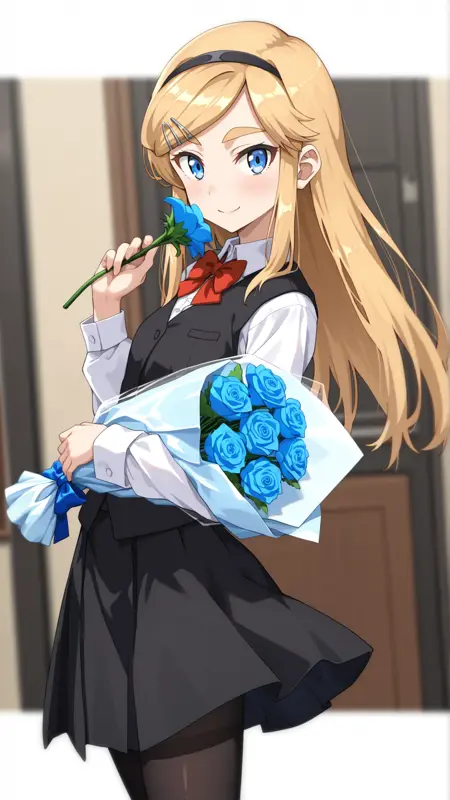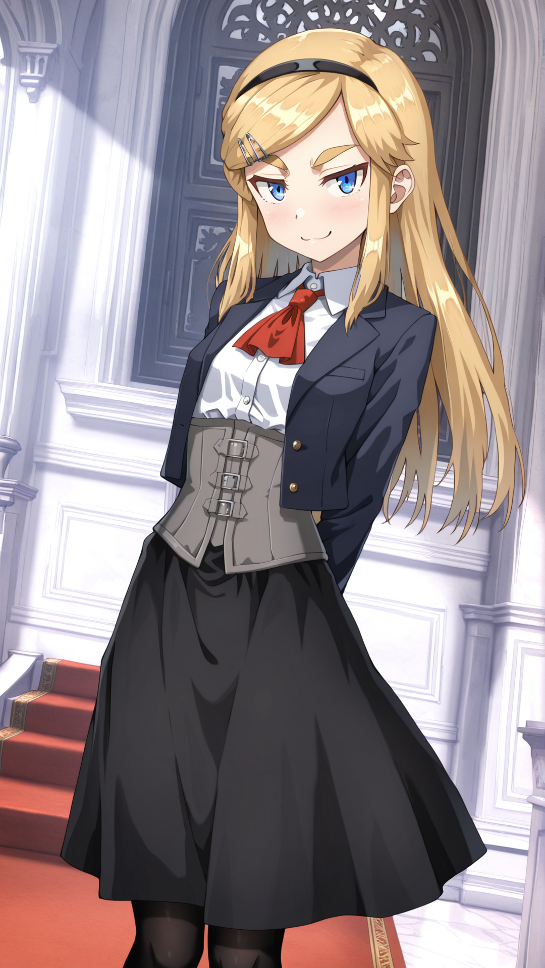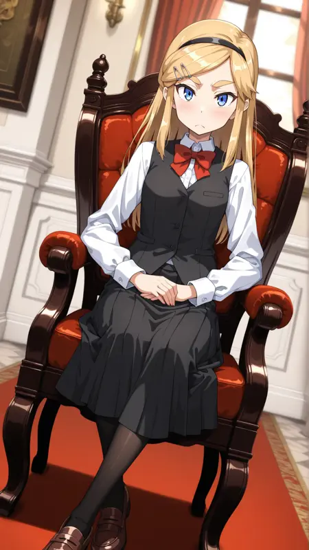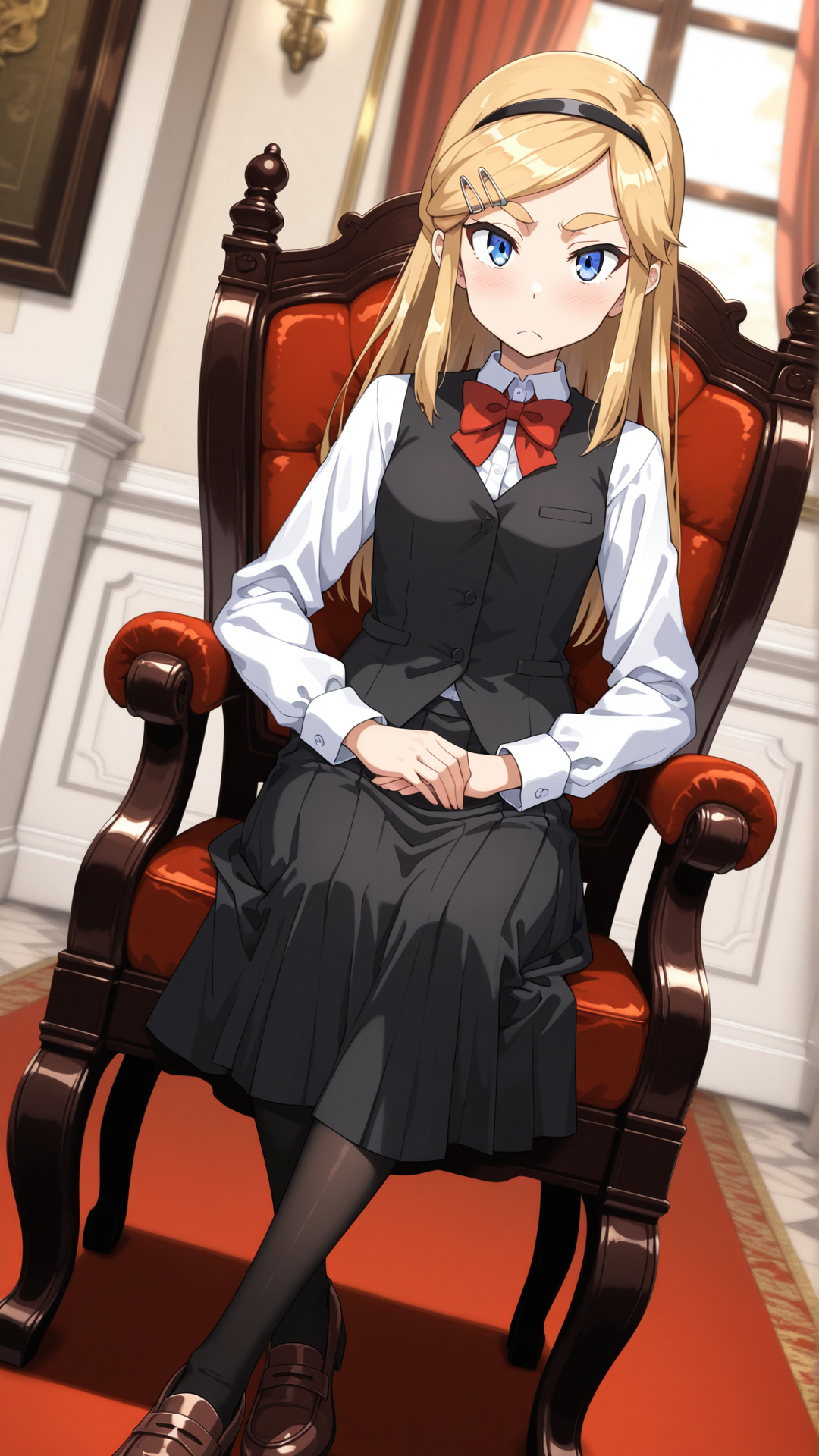 衣装: 黒いヘアバンド、ヘアクリップ、白いシャツ、黒いベスト、黒いスカート、黒いパンツストッキング、赤いボウタイ,