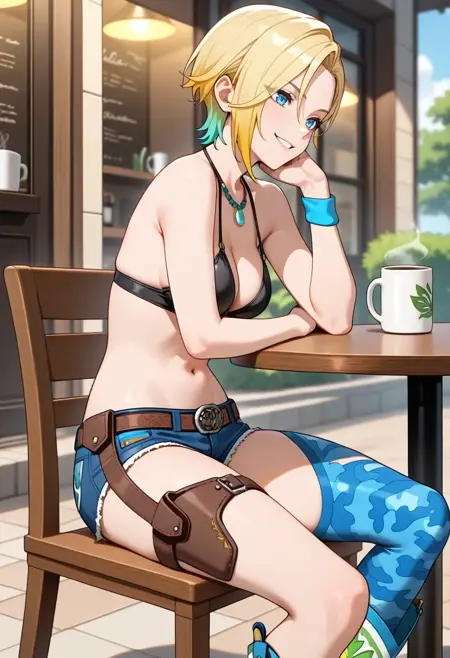 | トレーニングワード | bonnieblair,short hair, blonde hair, multicolored hair,medium breasts, tied shirt, midriff, jewelry, asymmetrical legwear, short shorts, holster, necklace,cowboy boots, wristband, white shirt, navel, belt, denim shorts, sleeves rolled up, cowboy hat, eyewear on headwear, sunglasses, front-tie top, camouflageコピーしました! |
