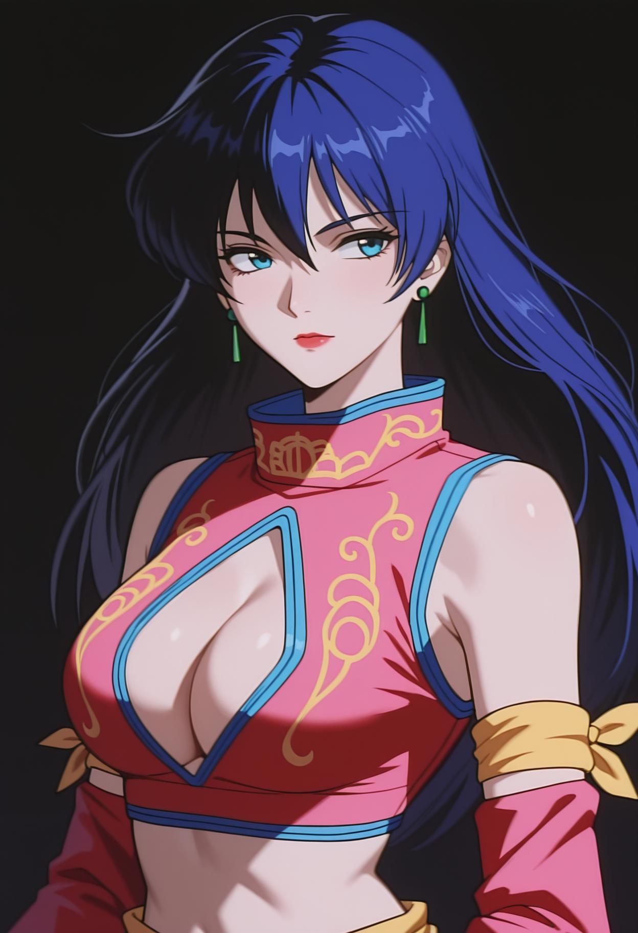 아이템 1: sh3o, 1소녀, 싱글, shan아웃핏, 소매 없는 치파오, 분리된 소매, 노출된 복부, 귀걸이, 어깨 리본, 허리 띠, 큰 가슴, 젖가슴 노출