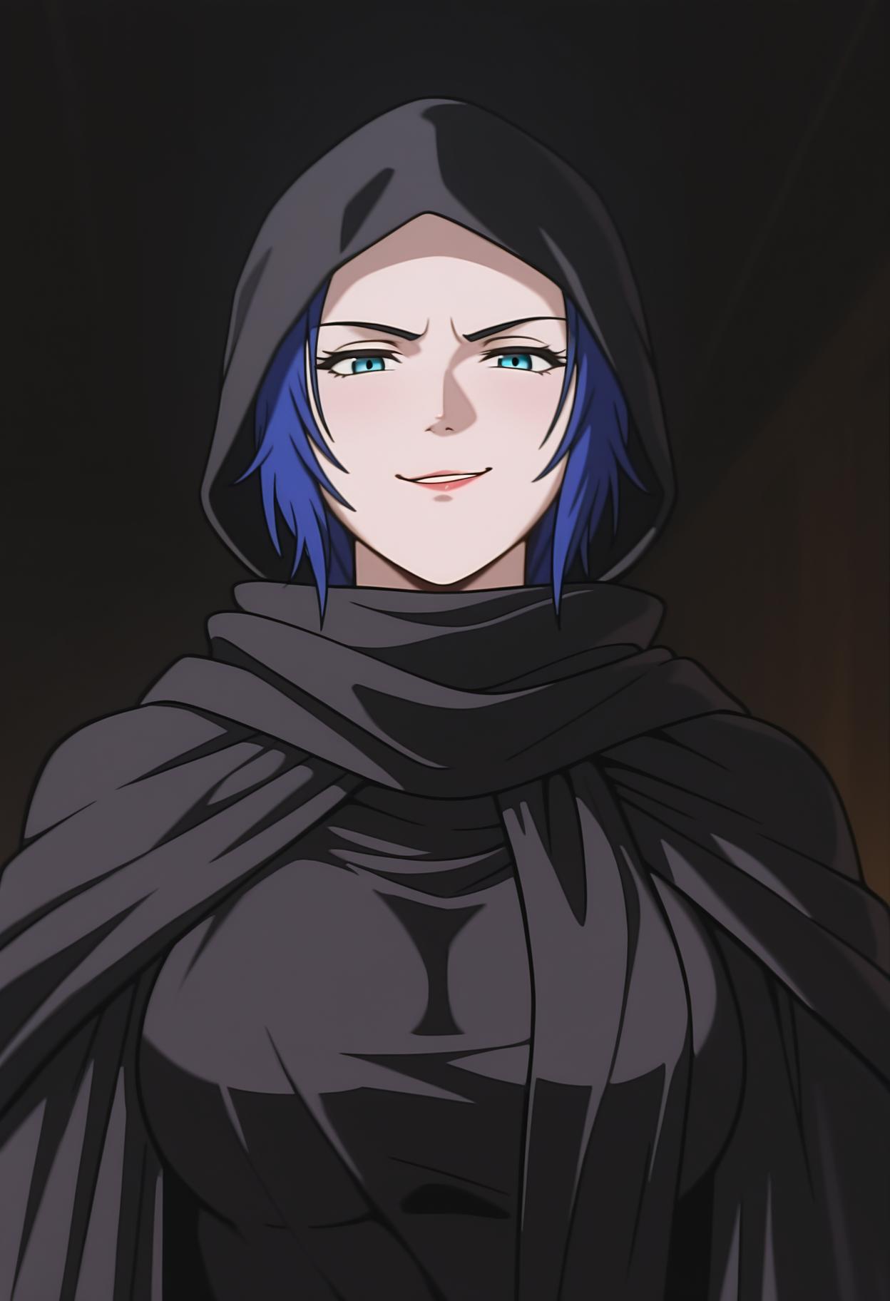 아이템 2: sh3o, 1소녀, 싱글, shan클로크, 망토, 검은 망토, 스카프, 후드, 얼굴 가린 상태, 큰 가슴