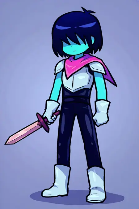 KrisFNF, blue skin, dark blue hair over eyes, silver armor, pink ribbon on neck, kris (deltarune),