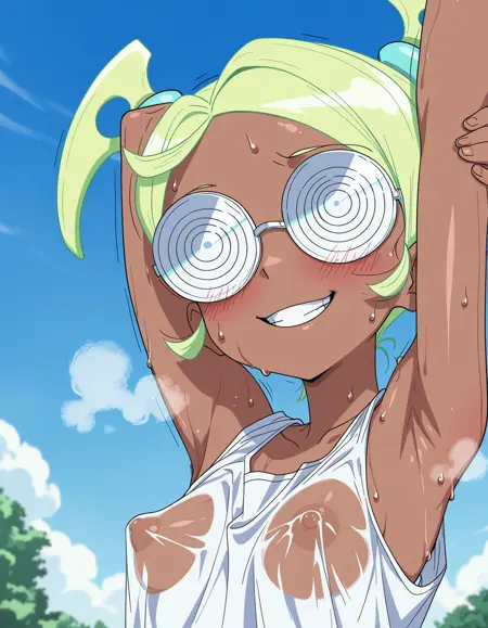 geek_girl_psg, coke-bottle glasses, dark skin, short twintails, green hair, white tank top, red shorts, backpack, blue sneakers